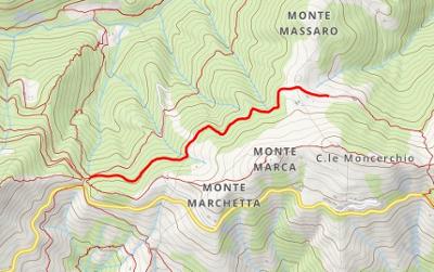 Von Bocchetto Sessera (1382 m) bis zur Alm Moncerchio (1430 m, Anschluß an Weg 9). Der leicht ansteigende Weg führt entlang der Nordseite des Marca.
