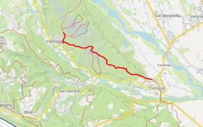 Usciti dall'abitato di Cerrione, una stradina dissestata sale tra gli alberi, fino a un bivio dove giriamo a destra per imboccare la strada della Mezza Bessa, che s'inoltra in un bosco in cui gli alberi crescono tra cumuli di ciottoli. All'inizio del percorso didattico del Parco della Bessa, percorriamo un sentiero che si unisce alla Strada delle Pietre Bianche. Superato il bivio per la fontana del Buchin arriviamo a una strada asfaltata nei pressi di Vermogno.