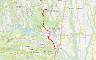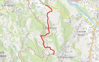 Il primo tratto si svolge lungo una carrareccia parallela al torrente Ingagna, che attraversiamo per salire verso Gallo lungo una strada asfaltata; superata Cascina Galliano, entriamo nel bosco percorrendo una bella carrareccia fino a Gerbiglie, frazione di Camburzano, dove imbocchiamo una strada asfaltata a sinistra.